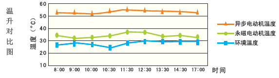 溫升低15~20℃ 與普通三相異步電動機相比,稀土永磁同步電動機的電阻損耗小,因此總損耗大大降低,同時也降低了電動機的溫升。經實測,在同等條件下,稀土永磁電動機的工作溫度比異步電動機低15~20℃,因此如果車間全部改造使用稀土永磁電動機,車間內的溫度將明顯降低,對改善夏季車間工作環境及節約空調用電有很大作用。 |